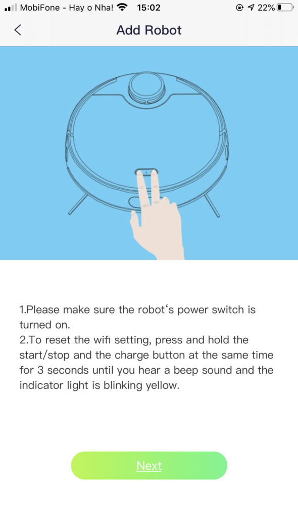 Lưu ý: Hãy chắc chắn thiết bị sử dụng để cài đặt (điện thoại) đã đăng nhập dùng mạng wifi nhà bạn. Robot chỉ dùng được wifi tần số 2.4 GHz, tần số 5.0 GHz vẫn chưa được hỗ trợ.